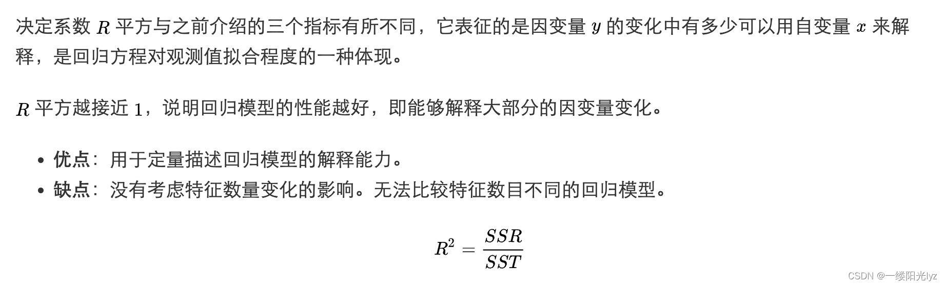 - SSR:Sum of Squares of the Regression,即预测数据与原始数据均值之差的平方和,反映的是模型相对原始数据均值的离散程度。