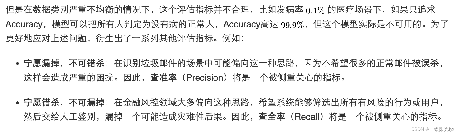 对于分类问题,精确率(Accuracy)指分类正确的样本数占样本总数的比例,是最常用的指标,可以总体上衡量一个预测的性能。一般情况(数据类别均衡)下,模型的精度越高,说明模型的效果越好。