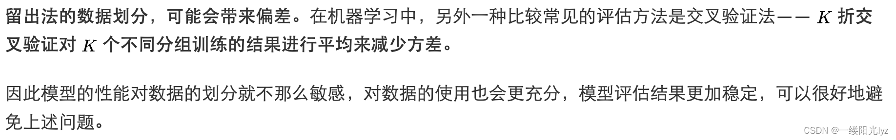 留出法是机器学习中最常见的评估方法之一,它会从训练数据中保留出验证样本集,这部分数据不用于训练,而用于模型评估。