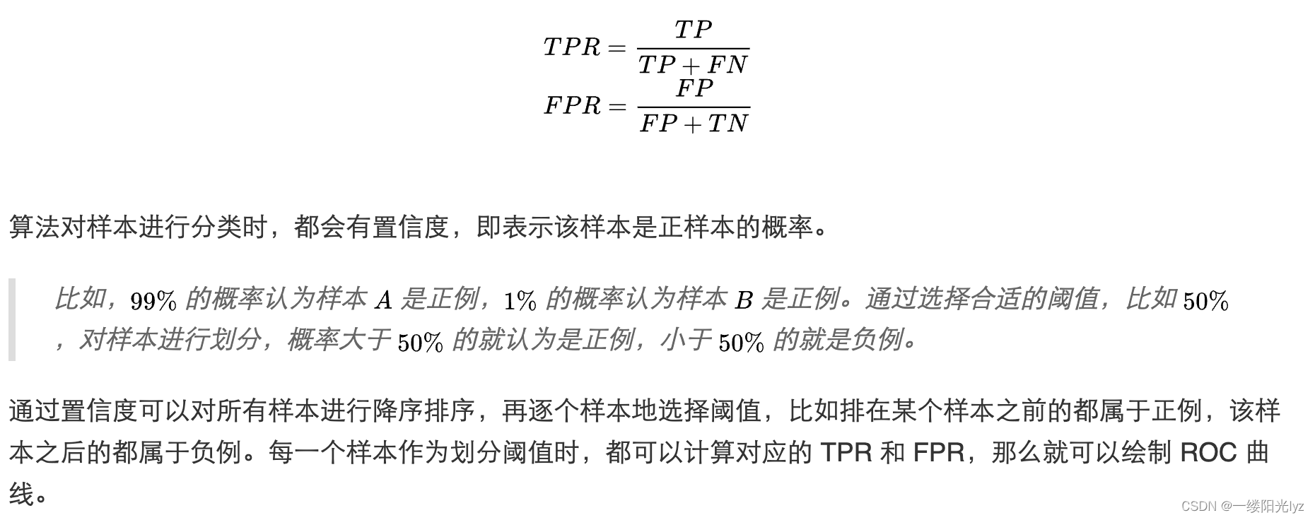 除了前面介绍的Accuracy、Precision 与 Recall,还有一些其他的度量标准,如使用 True Positive Rate(TPR,真正例率)和False Positive Rate(FPR,假正例率)两个指标来绘制 ROC 曲线。