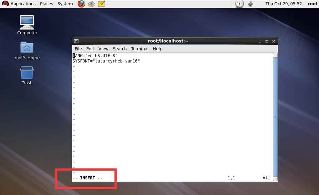 将第一行,LANG="en_US.UTF-8" 改成LANG="zh_CN.UTF-8",至于怎么改,这就是linux最基本的命令了,这边简单说下吧,因为是用vim命令打开的编辑器,那么可以按下键盘上的 i 键,可以看到左下角显示了“insert”: