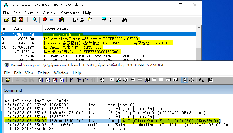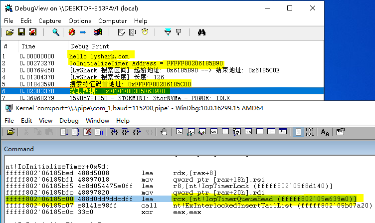 // 开始搜索,找到后返回首地址ptr = SearchSpecialCode(StartSearchAddress, size, pSpecialCode, ulSpecialCodeLength);DbgPrint("搜索特征码首地址: 0x%p \n", ptr);// 提取特征// fffff802`06185c00 488d0dd9ddcdff lea rcx,[nt!IopTimerQueueHead (fffff802`05e639e0)]ULONG64 iOffset = 0;ULONG64 IopTimerQueueHead_LyShark_Code = 0;__try{// 拷贝内存跳过lea,向后四字节RtlCopyMemory(&iOffset, (ULONG64)ptr + 3, 4);// 取出后面的IopTimerQueueHead内存地址 LyShark.comIopTimerQueueHead_LyShark_Code = iOffset + (ULONG64)ptr + 7;DbgPrint("提取数据: 0x%p \n", IopTimerQueueHead_LyShark_Code);}__except (1){DbgPrint("[LySHark] 拷贝内存异常 \n");}