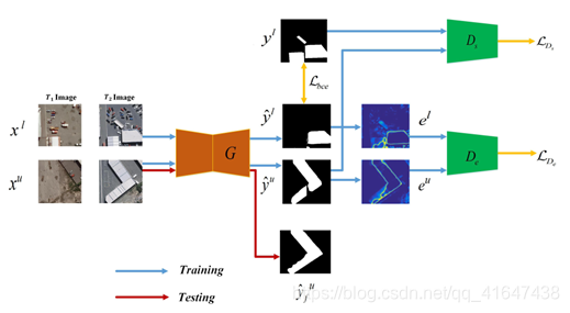 提出SemiCDNet变化检测网络包括一个生成器和两个判别器(分割判别,熵图判别),一个用于鼓励分割输出特征分布的一致性,另一个用于抑制未标记样本变化映射的不确定区域。