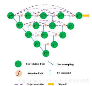 编码阶段,5个卷积单元,进行5次下采样,提取多尺度特征。解码阶段,采用密集跳跃连接,注意力单元被加到每一次拼接操作后面,这样可以有效地结合不同的特征。最后sigmoid层产生最后的分割图。