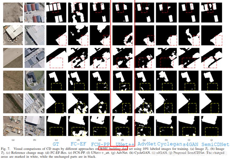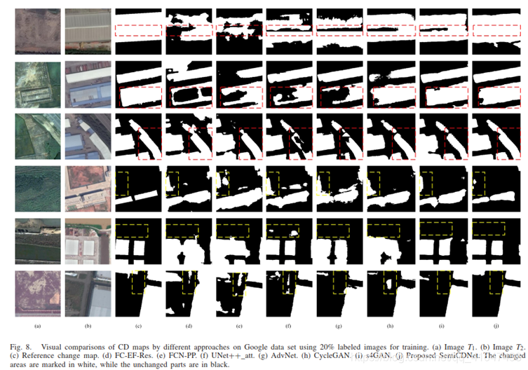 其他方法存在漏检,和误警。SemiCDNet的检测结果与GT更一致。比如和Baseline UNet++_att相比,SemiCDNet减少了漏检情况,如漏掉的建筑物或孔洞。