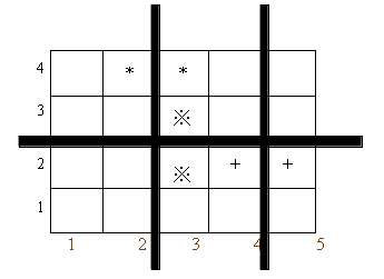 上图中用符号*、※、+ 标出了3对会交头接耳的学生的位置,图中3条粗线的位置表示通道,图示的通道划分方案是唯一的最佳方案。