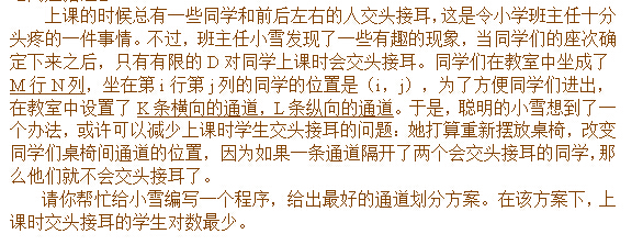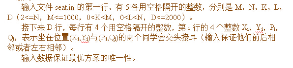 上课的时候总有一些同学和前后左右的人交头接耳,这是令小学班主任十分头疼的一件事情。不过,班主任小雪发现了一些有趣的现象,当同学们的座次确定下来之后,只有有限的D对同学上课时会交头接耳。同学们在教室中坐成了M行N列,坐在第i行第j列的同学的位置是(i,j),为了方便同学们进出,在教室中设置了K条横向的通道,L条纵向的通道。于是,聪明的小雪想到了一个办法,或许可以减少上课时学生交头接耳的问题:她打算重新摆放桌椅,改变同学们桌椅间通道的位置,因为如果一条通道隔开了两个会交头接耳的同学,那么他们就不会交头接耳了。