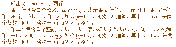 第二行包含L个整数,b1b2……bk,表示第b1列和b1+1列之间、第b2列和第b2+1列之间、…、第bL列和第bL+1列之间要开辟通道,其中bi< bi+1,每两个整数之间用空格隔开(行尾没有空格)。