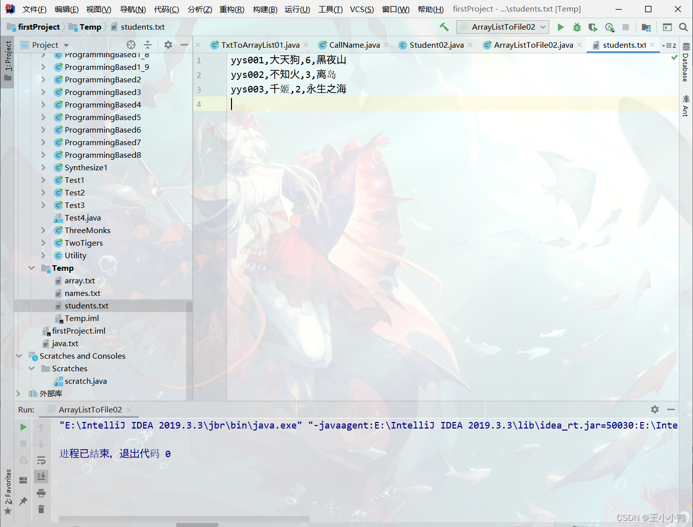 public class ArrayListToTxt01 {public static void main(String[] args) throws IOException {//创建ArrayList集合ArrayList array = new ArrayList();//往集合中存储字符串元素array.add("hello");array.add("world");array.add("java");//创建字符缓冲输出流对象BufferedWriter bw = new BufferedWriter(new FileWriter("Temp\\array.txt"));//遍历集合,得到每一个字符串数据for(String s : array) {//调用字符缓冲输出流对象的方法写数据bw.write(s);bw.newLine();bw.flush();}//释放资源bw.close();}}