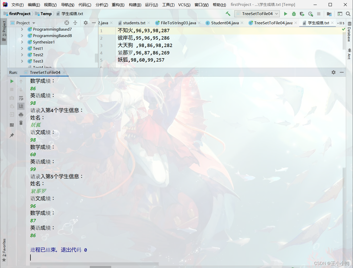 public class TreeSetToFileDemo {public static void main(String[] args) throws IOException {//创建TreeSet集合,通过比较器排序进行排序TreeSetts = new TreeSet (new Comparator () {@Overridepublic int compare(Student s1, Student s2) {//成绩总分从高到低int num = s2.getSum() - s1.getSum();//次要条件int num2 = num == 0 ? s1.getChinese() - s2.getChinese() : num;int num3 = num2 == 0 ? s1.getMath() - s2.getMath() : num2;int num4 = num3 == 0 ? s1.getName().compareTo(s2.getName()) : num3;return num4;}});//键盘录入学生数据for (int i = 0; i < 5; i++) {Scanner sc = new Scanner(System.in);System.out.println("请录入第" + (i + 1) + "个学生信息:");System.out.println("姓名:");String name = sc.nextLine();System.out.println("语文成绩:");int chinese = sc.nextInt();System.out.println("数学成绩:");int math = sc.nextInt();System.out.println("英语成绩:");int english = sc.nextInt();//创建学生对象,把键盘录入的数据对应赋值给学生对象的成员变量Student s = new Student();s.setName(name);s.setChinese(chinese);s.setMath(math);s.setEnglish(english);//把学生对象添加到TreeSet集合ts.add(s);}//创建字符缓冲输出流对象BufferedWriter bw = new BufferedWriter(new FileWriter("myCharStream\\ts.txt"));//遍历集合,得到每一个学生对象for (Student s : ts) {//把学生对象的数据拼接成指定格式的字符串//格式:姓名,语文成绩,数学成绩,英语成绩StringBuilder sb = new StringBuilder();sb.append(s.getName()).append(",").append(s.getChinese()).append(",").append(s.getMath()).append(",").append(s.getEnglish()).append(",").append(s.getSum());// 调用字符缓冲输出流对象的方法写数据bw.write(sb.toString());bw.newLine();bw.flush();}//释放资源bw.close();} }
