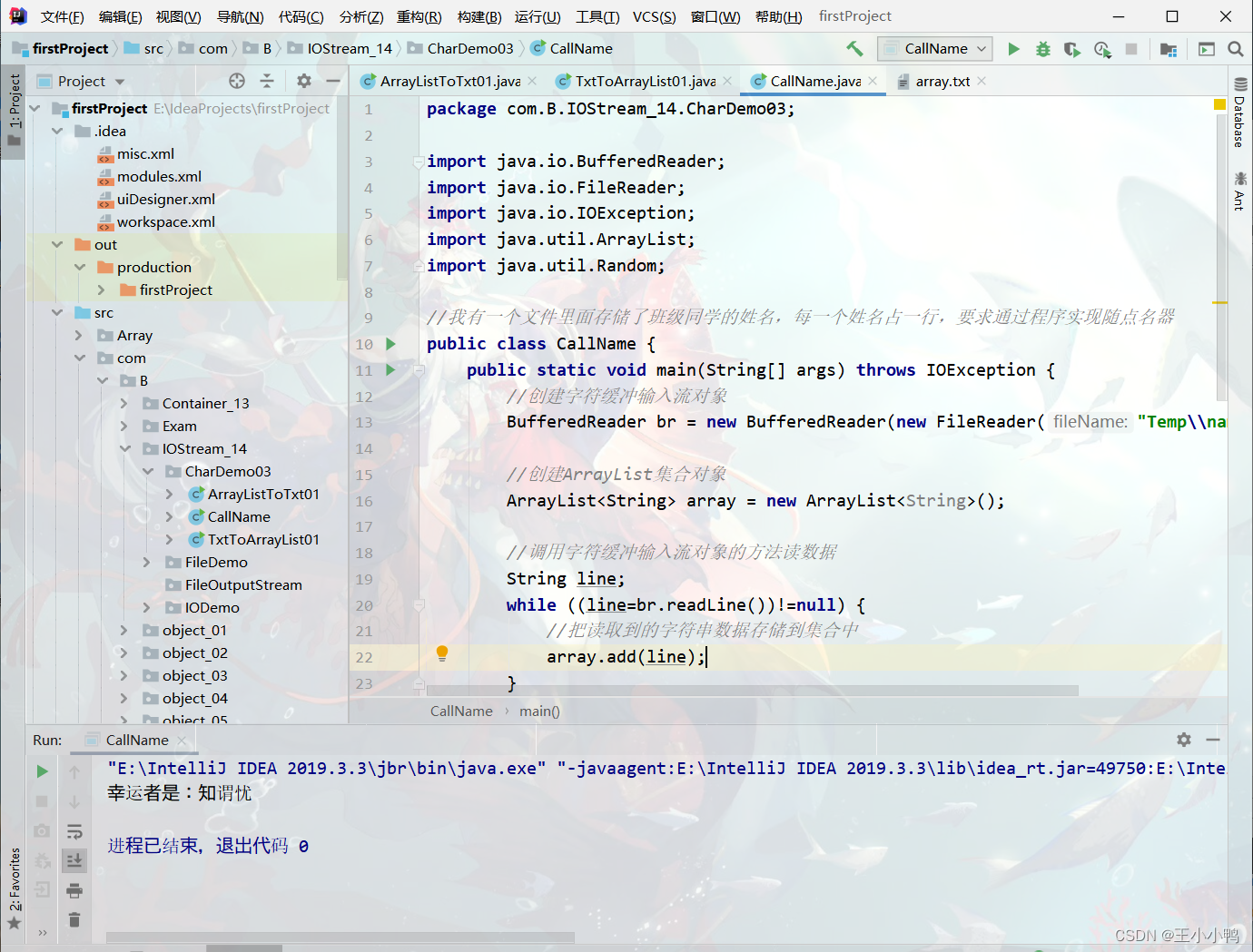 public class CallNameDemo {public static void main(String[] args) throws IOException {//创建字符缓冲输入流对象BufferedReader br = new BufferedReader(new FileReader("myCharStream\\names.txt"));//创建ArrayList集合对象ArrayListarray = new ArrayList ();//调用字符缓冲输入流对象的方法读数据String line;while ((line=br.readLine())!=null) {//把读取到的字符串数据存储到集合中array.add(line);}//释放资源br.close();//使用Random产生一个随机数,随机数的范围在:[0,集合的长度)Random r = new Random();int index = r.nextInt(array.size());//把第6步产生的随机数作为索引到ArrayList集合中获取值String name = array.get(index);//把第7步得到的数据输出在控制台System.out.println("幸运者是:" + name);} }