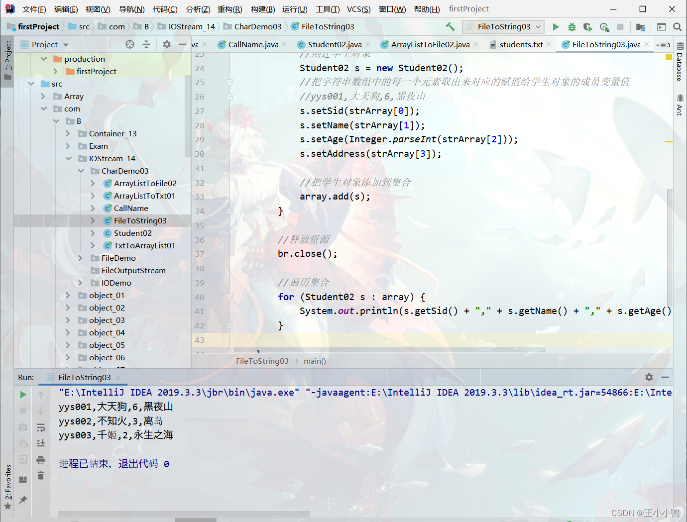 public class FileToArrayListDemo {public static void main(String[] args) throws IOException {//创建字符缓冲输入流对象BufferedReader br = new BufferedReader(new FileReader("myCharStream\\students.txt"));//创建ArrayList集合对象ArrayListarray = new ArrayList ();//调用字符缓冲输入流对象的方法读数据String line;while ((line = br.readLine()) != null) {//把读取到的字符串数据用split()进行分割,得到一个字符串数组String[] strArray = line.split(",");//创建学生对象Student s = new Student();//把字符串数组中的每一个元素取出来对应的赋值给学生对象的成员变量值//itheima001,林青霞,30,西安s.setSid(strArray[0]);s.setName(strArray[1]);s.setAge(Integer.parseInt(strArray[2]));s.setAddress(strArray[3]);//把学生对象添加到集合array.add(s);}//释放资源br.close();//遍历集合for (Student s : array) {System.out.println(s.getSid() + "," + s.getName() + "," + s.getAge() + "," + s.getAddress());}} }