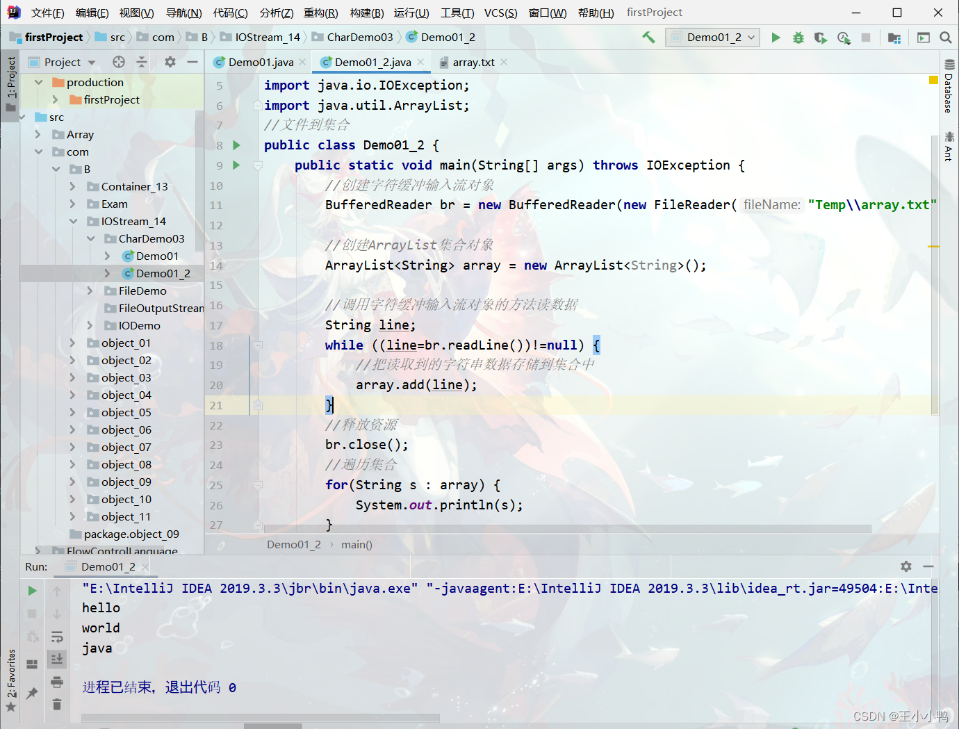 package com.B.IOStream_14.CharDemo03;import java.io.BufferedReader; import java.io.FileReader; import java.io.IOException; import java.util.ArrayList; //文件到集合 public class TxtToArrayList01 {public static void main(String[] args) throws IOException {//创建字符缓冲输入流对象BufferedReader br = new BufferedReader(new FileReader("Temp\\array.txt"));//创建ArrayList集合对象ArrayListarray = new ArrayList ();//调用字符缓冲输入流对象的方法读数据String line;while ((line=br.readLine())!=null) {//把读取到的字符串数据存储到集合中array.add(line);}//释放资源br.close();//遍历集合for(String s : array) {System.out.println(s);}} }