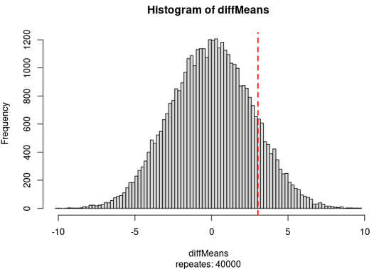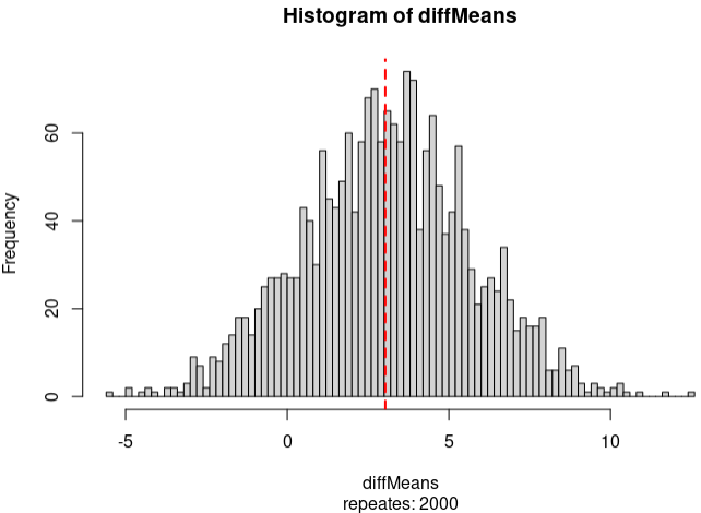 doTest=function(len=100, seed=20211009){# samplingset.seed(seed)diffMeans=c()for(i in 1:len){groupA=sample( seq(1,40), 20)groupB=setdiff( seq(1,40), groupA)#meanA=mean( stu[groupA] ) meanB=mean( stu[groupB] )diffMeans = c(diffMeans, meanA - meanB)}# plothist(diffMeans, n=100, sub=paste("repeates:", len) )abline(v=diff1, lty=2, col="red", lwd=2)# method1, p = bigger / np1= 2* as.numeric( table(diffMeans > diff1)[2] ) / len; #p1return( c(len, p1))