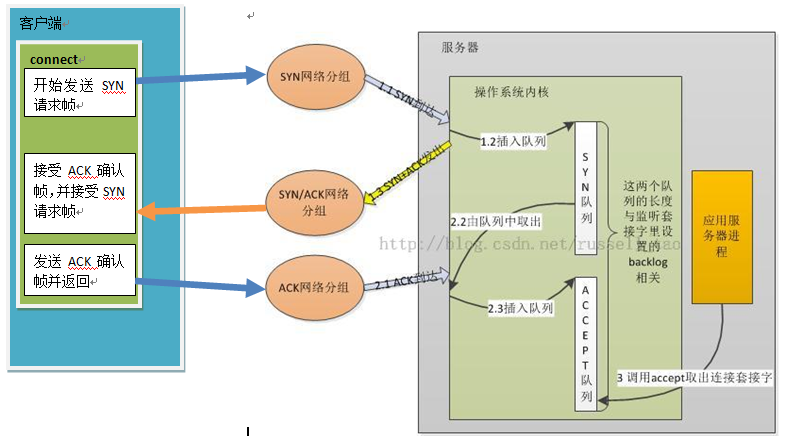 - 服务器端在调用listen之后,内核会建立两个队列,SYN队列和ACCEPT队列,其中ACCPET队列的长度由backlog指定。