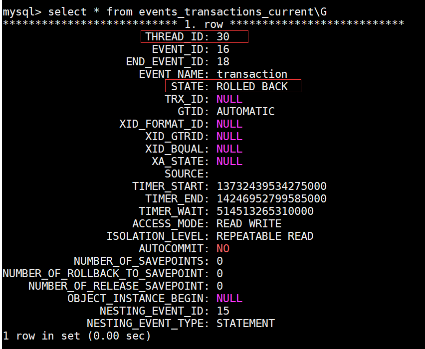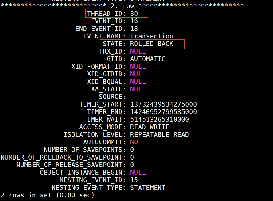 可以看到在两表中都记录了一行事务事件信息,线程ID为30的线程执行了一个事务,事务状态为ROLLED BACK。