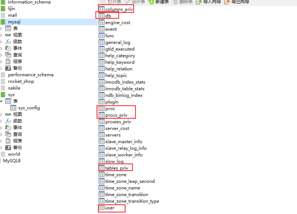 可以看到,这两个表都位于mysql系统数据库下边,其中: