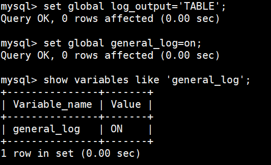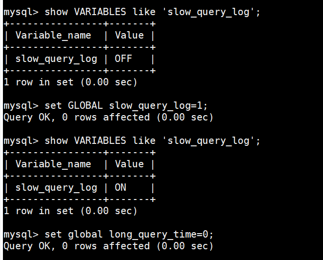 set global log_queries_not_using_indexes=on; set global log_slow_admin_statements=on; show variables like 'log_queries_not_using_indexes'; show variables like 'log_slow_admin_statements';