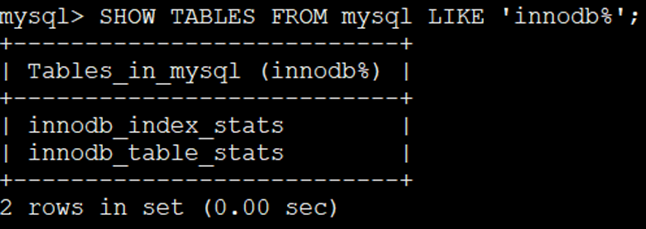 SHOW TABLES FROM mysql LIKE 'innodb%';