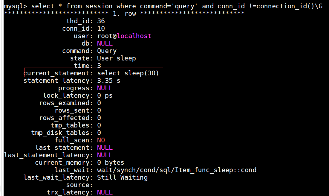配置好之后,我们就可以查看Server当前正在做什么了。可以通过查询events_waits_current表来得知,该表中每个线程只包含一行数据,用于显示每个线程的最新监视事件(正在做的事情)。