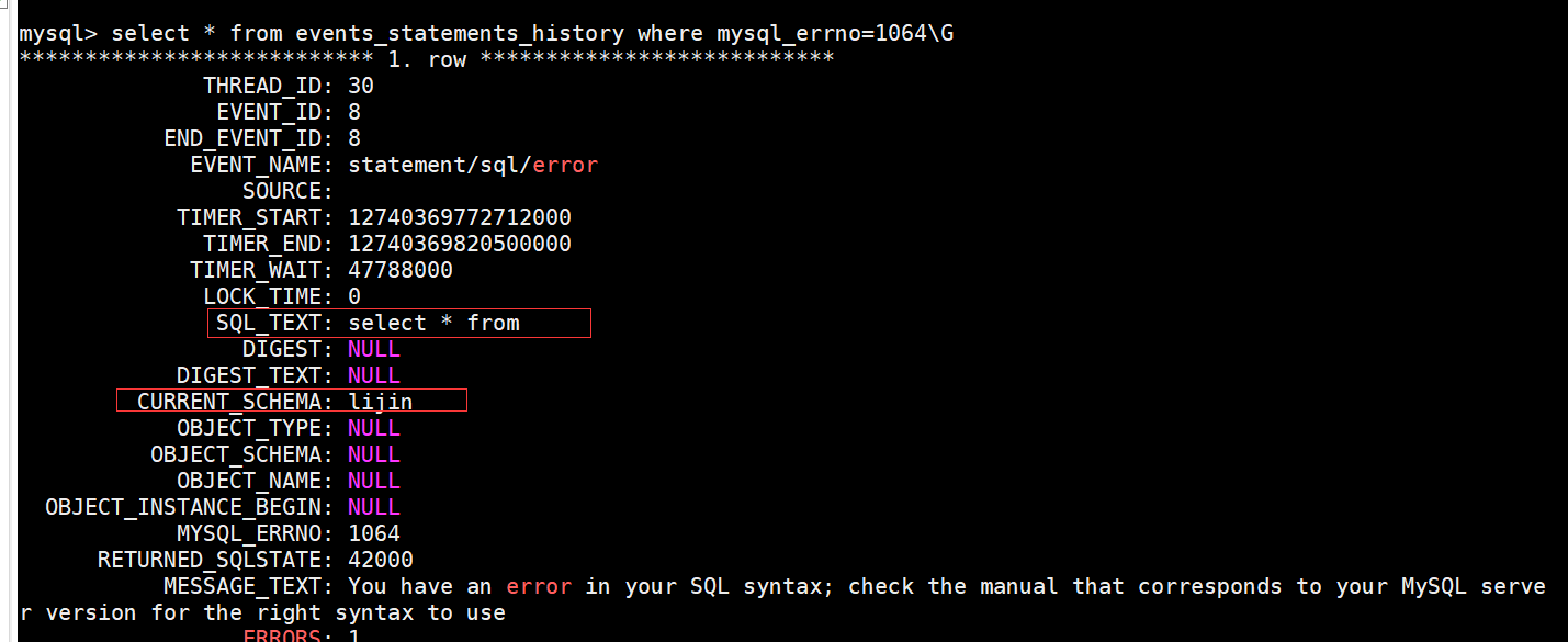 首先,我们模拟一条语法错误的SQL语句,使用events_statements_history_long表或events_statements_history表查询发生语法错误的SQL语句: