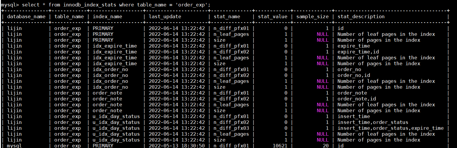 innodb_index_stats表的每条记录代表着一个索引的一个统计项。可能这会大家有些懵逼这个统计项到底指什么,别着急,我们直接看一下关于order_exp表的索引统计数据都有些什么:
