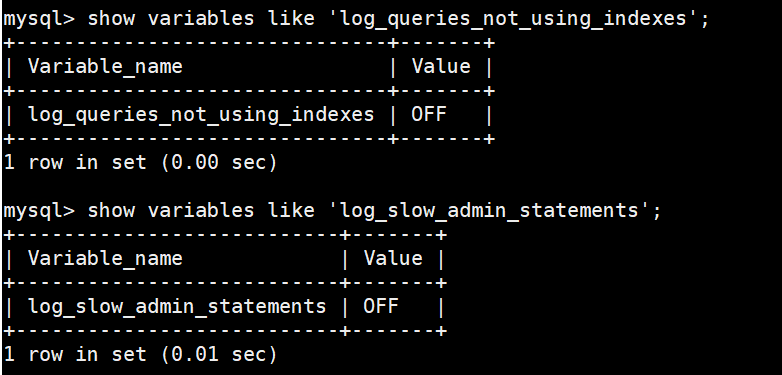show variables like 'log_queries_not_using_indexes'; show variables like 'log_slow_admin_statements';