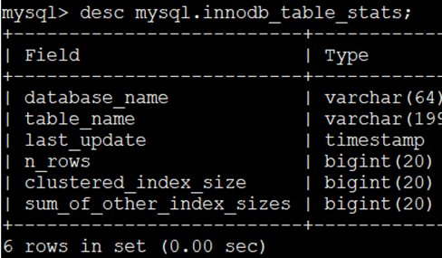 clustered_index_size和sum_of_other_index_sizes统计项的收集牵涉到很具体的InnoDB表空间的知识和存储页面数据的细节,我们就不深入讲解了。