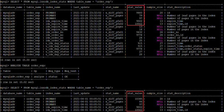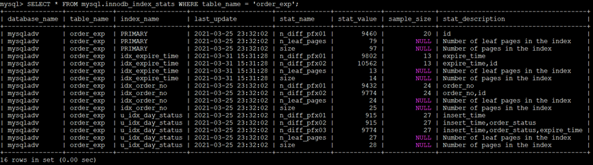 SELECT * FROM mysql.innodb_index_stats WHERE table_name = 'order_exp';