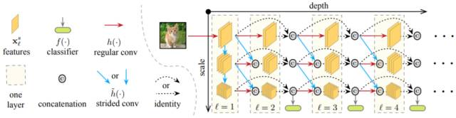 图 2:具有三个比例的 MSDNet 的前四层图示。水平方向对应于网络的层方向(深度),垂直方向对英语特征图的比例。水平箭头表示常规卷积操作,而对角线和垂直箭头表示步进卷积操作。分类器仅在最粗糙比例的特征映射上运行。跨越超过一层的连接未明确绘制:它们隐藏地通过递归串联。