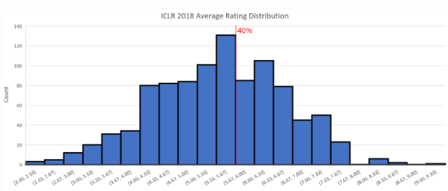 根据Andrej Karpathy的介绍,在今年4月的ICLR 2017大会上,提交论文的数量为491篇,而被接受的情况为:15 篇 oral(3%),183 篇 poster(37.3%)。所以上图中我们给出了40%的接收线作为参考。