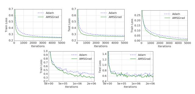 图 2:ADAM 和 AMSGRAD 算法在 Logistic 回归、前馈神经网络和 CIFARNET 上的性能对比。
