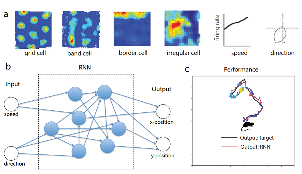 图 1:其中 a)为样本神经数据表示 EC 空间导航任务中不同神经关联性。b)中的循环网络由 N = 100 个循环单元(或神经元)组成,它们接收两个外部输入,即代表动物的速度和方向。c)为训练后的典型轨迹,RNN 的输出可以精确地在导航期间追踪动物的位置。