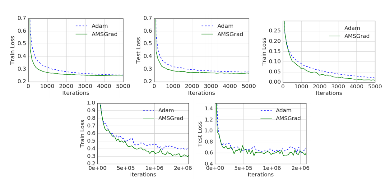 图 2:ADAM 和 AMSGRAD 算法在 Logistic 回归、前馈神经网络和 CIFARNET 上的性能对比。