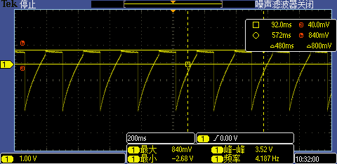 从上图我们能可以看到,通道1维持在0.7V的时候,通道二的电压仍在爬坡,爬坡波形和电容充电波形基本一致。最高爬坡点为3.1V左右,3.1V-0.7V=2.4V,该电压刚好是电容两端的电压。