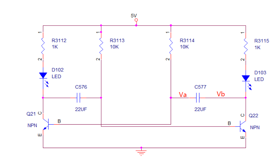 此时,VCC通过R3113电阻对C576电容进行充电,当充电到0.7V时,Q22三极管会导通。原先C577电容两端电压为0V,那么Q22导通瞬间,C577电容两端电压在该时刻也会维持在0V,Q21三极管基级B给拉低到0V,Q21关断。此时,VCC对C577电容进行充电,充电到0.7V时,Q21再次导通。反复循环即可点亮LED灯。