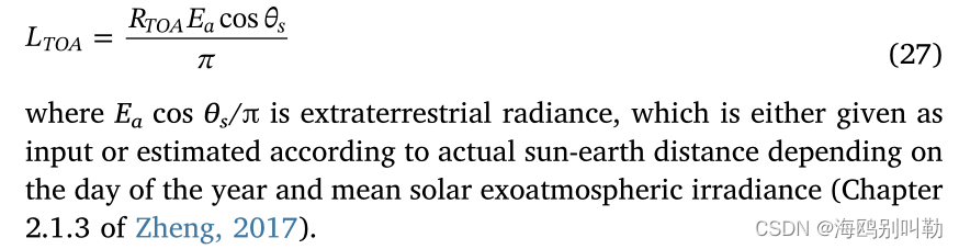 需求:已知影像辐亮度,求表观反射率,需先计算传感器各波段地外辐射