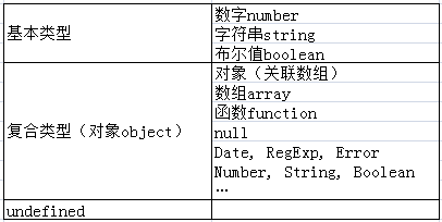 复合类型中,关联数组是对象的基本形式;数组略微特殊,用下标定位;函数更为特殊,有自己的语法;null是一个特殊值,表示无对象;其余为类(专用对象),其中Number, String, Boolean为对应基本类型的包装对象。