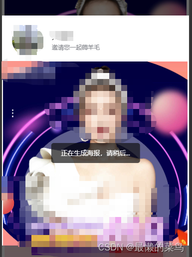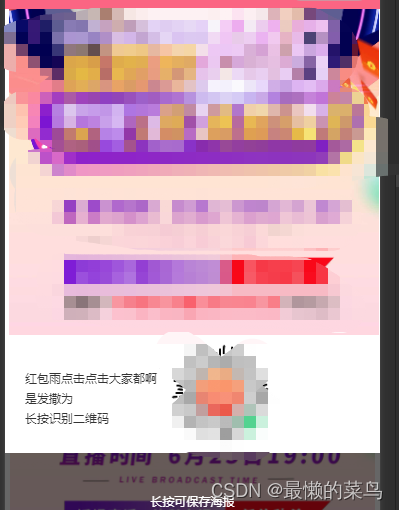 data() {return {width: 0,height:0}},methods: {//生成海报generatePoster() {let that=this//计算图片尺寸uni.getImageInfo({src: req.data.poster.image.url,success: function (image) {let height = 200;let allwh = image.width + image.height;let imgwidth = (image.width / allwh).toFixed(2);let imgheight = (image.height / allwh).toFixed(2);that.width = imgwidth*1000;that.height = (imgheight*1000) + height;// 这里是创建 canvas 绘图上下文let context = uni.createCanvasContext('myCanvas');// 这里可以根据自己的需求显示加载动画uni.showToast({title: '正在生成海报,请稍后...',icon: 'none',duration: 3000});// 给整个canvas填充白色背景(这个如果不加上的话,在APP端生成的海报没有白色背景)context.setFillStyle('#ffffff');context.fillRect(0, 0,500, that.height);context.draw();// 绘制用户昵称context.setFontSize(14);context.setFillStyle('#000000');// 这里根据自己的项目填写用户昵称的字段//let user = uni.getStorageSync('user')context.fillText('昵称', 100, 48);context.setFontSize(12);context.setFillStyle('#82848a');context.fillText('早上好!!这是您专属', 100, 68);// 绘制价格// context.setFontSize(18);// context.setFillStyle('red');// context.fillText(`¥199`, 20, 366);// // 绘制商品名称,按字符串长度进行分割换行。that.drawText('描述....', 20, that.height+120-height, context);that.drawText('长按识别二维码', 20, that.height+160-height, context);// 绘制头像uni.downloadFile({url: '', //用户的头像地址(一定要是网络路径)success: function(res) {context.save();// 这个就是绘制圆形头像context.beginPath();context.arc(50, 50, 30, 0, 2 * Math.PI)context.clip();context.drawImage(res.tempFilePath, 20, 20, 60, 60);context.restore();context.draw(true);}});// 绘制图片详情uni.downloadFile({url: '', //分享图片网络地址success: function(res) {context.drawImage(res.tempFilePath, 2, 92, that.width, that.height-height);context.draw(true);}});// 绘制小程序码uni.downloadFile({url: '',//二维码图片网络地址success: function(res) {context.drawImage(res.tempFilePath, 165, that.height+100-height, 100, 100);context.draw(true);}});// 绘制完成,让canvas显示【这里看自己项目,是否有loading动画】that.posterInfo.status = true;}});},// 海报描述文字换行drawText(context, x, y, canvas) {let strArr = [];let n = 11;for (let i = 0, l = context.length; i < l / n; i++) {let a = context.slice(n * i, n * (i + 1));strArr.push(a);}strArr.forEach((item, index) => {// 限制只能显示4行文字if (index > 3) {return;}y += 20;canvas.setFontSize(12);canvas.setFillStyle('#333333');canvas.fillText(item, x, y);});},// 长按保存生成的海报saveSharePic() {uni.showModal({title: '提示',content: '保存海报分享给好友 o(∩_∩)o',success: function(res) {if (res.confirm) {// canvas生成图片uni.canvasToTempFilePath({// 这里修改保存的图片格式fileType: 'jpg',canvasId: 'myCanvas',quality: 1,success: function(res) {// 保存带哦本地uni.saveImageToPhotosAlbum({filePath: res.tempFilePath,success: function() {uni.showToast({title: '保存海报成功',icon: 'none',duration: 3000});},fail: function() {uni.showToast({title: '保存海报失败',icon: 'none',duration: 3000});}});}});}}});}}