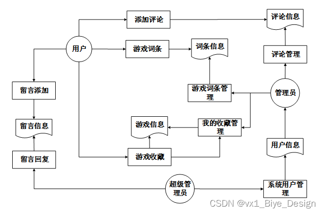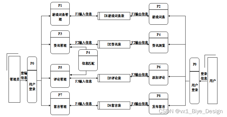 系统数据流图中,数据流实体主要是管理员,数据流程包括留言管理;数据流包括添加信息、删除信息、修改信息、查询信息、浏览信息、提示信息;数据表包括资讯表、游戏词条表。