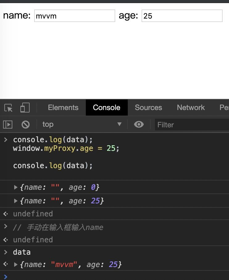 先打印了data,然后模拟有异步数据过来,手动修改data里的数据window.myProxy.age=25,这时候页面上的age联动变化为25,再次打印了查看data。接下来在页面上手动输入name,输入完成后触发输入框的onchange事件后,再次查看data,此时model里的数据已经变化为最新的与页面保持一致的值。