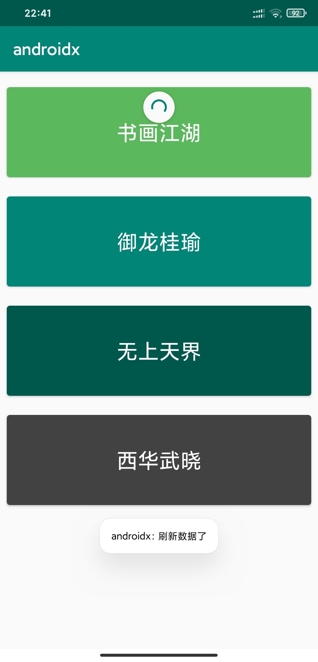 public class DemoActivity extends AppCompatActivity {SwipeRefreshLayout swipeLayout;@Overrideprotected void onCreate(@Nullable Bundle savedInstanceState) {super.onCreate(savedInstanceState);setContentView(R.layout.api_demo2_layout);swipeLayout = findViewById(R.id.swipeLayout);initView();}private void initView() {swipeLayout.setColorSchemeColors(ContextCompat.getColor(this, R.color.colorPrimary));swipeLayout.setOnRefreshListener(new SwipeRefreshLayout.OnRefreshListener() {@Overridepublic void onRefresh() {Toast.makeText(DemoActivity.this,"刷新数据了",Toast.LENGTH_LONG).show();swipeLayout.postDelayed(new Runnable() {@Overridepublic void run() {swipeLayout.setRefreshing(false);}}, 1500);}});}