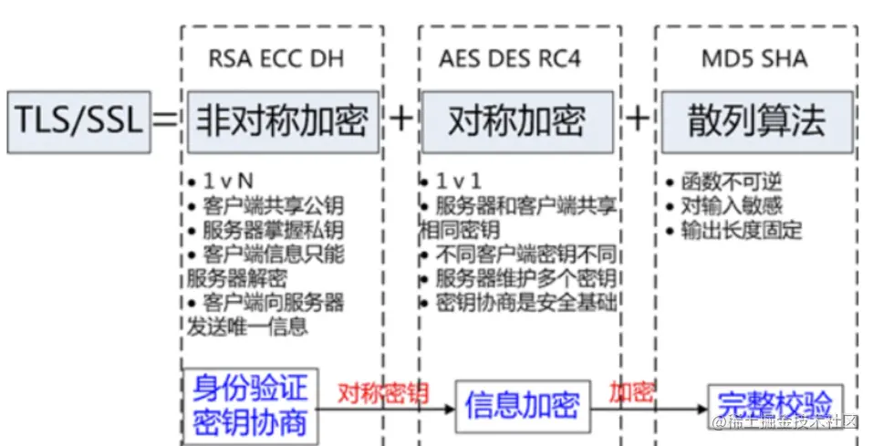 TLS/SSL的功能实现主要依赖三类基本算法:散列函数hash、对称加密、非对称加密。这三类算法的作用如下: