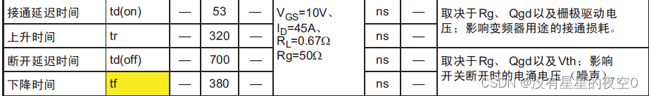 Coss:输出电容。具有Vds依存性;影响负载轻时的下降时间tf。