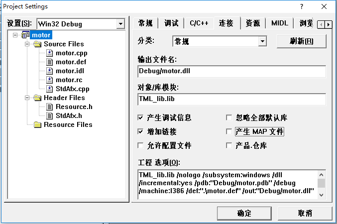 3)用VC++ 6.0 打开Project工程,选中工程,然后选择VC++ 6.0菜单下的Project->Settings(设置 ), 在弹出的对话框中选择Link(连接)选项卡,然后在Object/library modules(对象/库模块)输入框中输入TML_lib.lib,点击OK