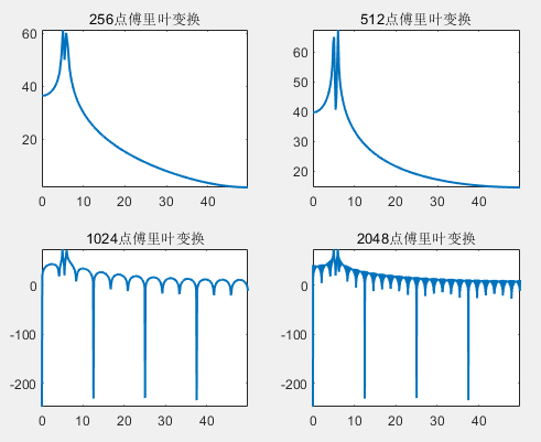 从运行结果可以看出,当N=256时刚刚能区分出两种频率成分,可能 N 再减小一些就无法分辨这两种频率成分了,即 N 再减小就可能发生栅栏效应;当 N=1024 和 N=2048 时,频谱发生畸变,也就是说 N 并不是越大越好。