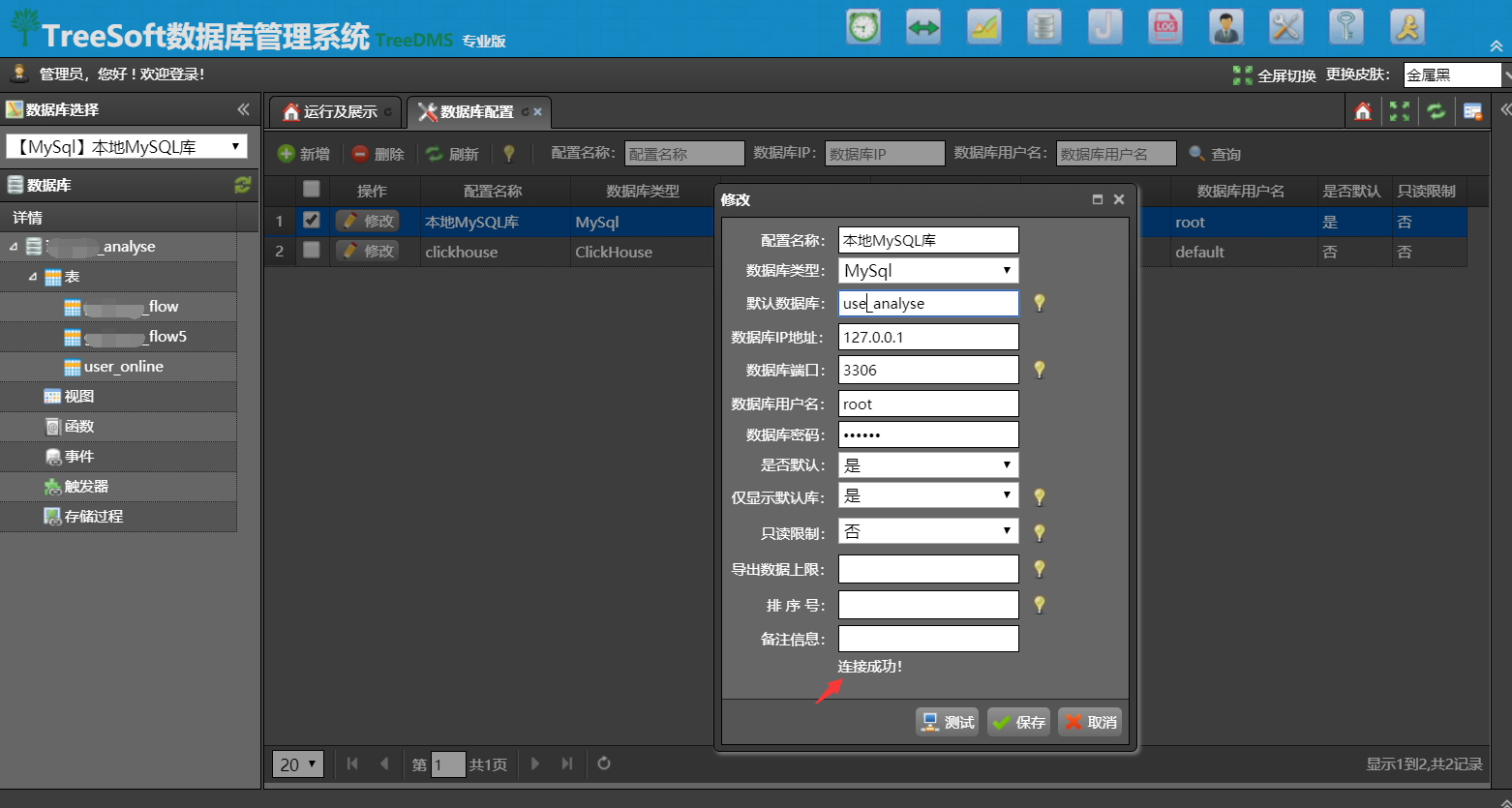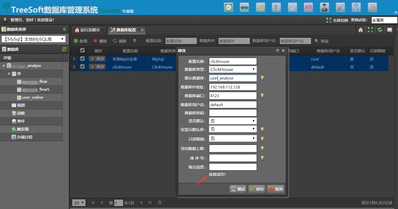 1、安装TreeSoft软件后,登录并分别配置MySQL、clickHouse连接信息,并测试连接成功!