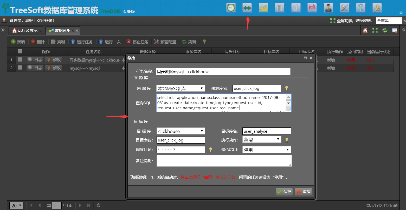 2、进行数据同步任务的配置,指定来源库、目标库、查询SQL、调度计划