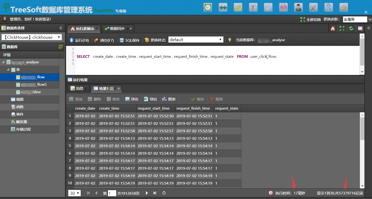 4、直接写一个查询SQL命令并运行,测试环境有5千多万行数据,速度真是非常非常快。