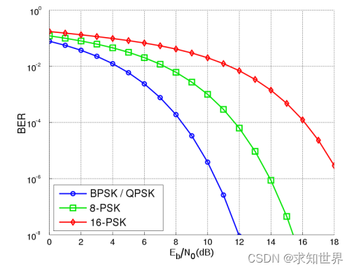在数字通信系统中,我们经常用Eb/No表示信号与噪声的强弱关系,由于在系统传输中会采用不同的调制技术,而不同的调制技术下频谱效率会不同,如图所示。